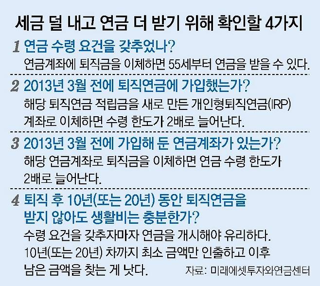 절세 효과를 높이려면 연금 수령 요건을 갖출 때 즉시 연금 개시를 신청하자. 10년 차(또는 20년 차)가 될 때까지는 매년 최소 금액만 찾다가, 남은 금액은 10년 차(또는 21년 차) 이후에 찾아서 쓰면 된다.