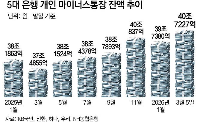 지난달 28일 시작된 미국과 이란의 전쟁으로 국내 증시가 하루에 10%가량 급락하거나 급등하는 '현기증 장세'를 이어가는 가운데, 은행 마이너스통장(마통·신용한도 대출) 잔액이 하루 평균 수천억 원씩 불어나 '빚투'(빚내서 투자) 우려가 커지고 있다.