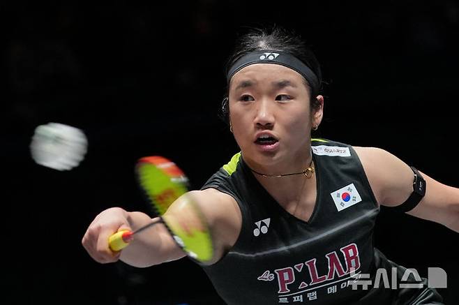 [버밍엄=AP/뉴시스] 안세영이 8일(현지 시간) 영국 버밍엄 유틸리타 아레나에서 열린 2026 세계배드민턴연맹(BWF) 월드 투어(슈퍼 1000) 전영오픈 여자 단식 결승에서 왕즈이(중국)와 경기를 치르고 있다. 안세영은 왕즈이에게 0-2(15-21 19-21)로 패배했다. 2026.03.09.