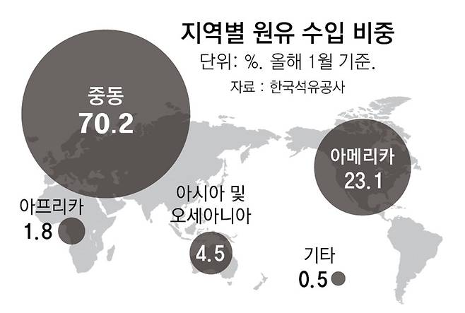 한국의 경우 중동산 원유 의존도가 높기 때문에 중동 리스크에 취약한 편이다. 올해 1월 기준 국내 원유 수입 물량의 대륙별 비중은 중동산이 70.2%로 압도적이다. 이어 아메리카(23.1%), 아시아·오세아니아(4.5%), 아프리카(1.8%) 순이다.