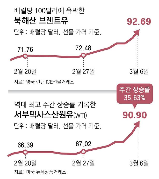 뉴욕상품거래소에 따르면 6일(현지 시간) 서부텍사스산원유(WTI) 4월 인도분 가격은 전 거래일 대비 12.21% 급등한 배럴당 90.90달러로 마감했다. 전쟁 발발 전인 지난달 27일(67.02달러) 대비 한 주 만에 35.63% 치솟아 1983년 통계 집계 이래 주간 기준 역대 최대 상승률을 기록했다.