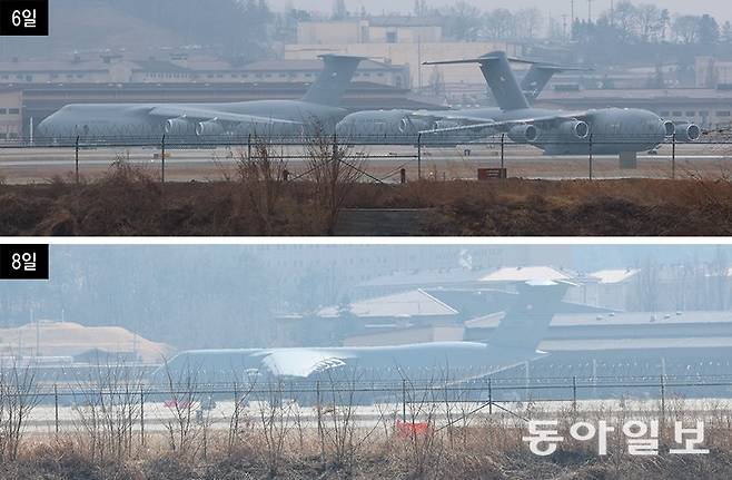 | 韓 왔던 美 대형 수송기들 줄줄이 떠나 주한미군 공군기지에서 C-5, C-17 등 미군 대형 수송기들이 줄줄이 한국을 떠나는 등 미국과 이란 전쟁에 주한미군 전력이 차출된 것으로 추정되고 있다. 6일 C-5와 C-17이 경기 평택 주한미군 오산기지에서 연료를 주입하는 등 이륙을 준비하고 있다(위 사진). 8일 오산기지에서 C-5가 대기하고 있는 모습. 평택=전영한 scoopjyh@donga.com·김재명 기자 |
