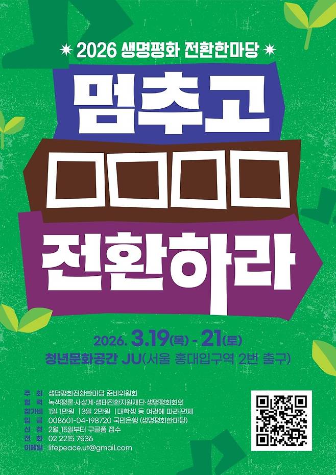 최대공약수보단 최소공배수를 찾기 위한 한마당이다. ‘멈추고 □□□□ 전환하라’라는 제목에 “각자 채워 넣어야 할 몫을 찾아보자”는 뜻이 담겼다. 우리가 속박된 인간과 인간, 인간과 자연을 죽이는 ‘죽임의 문명’을 일단 멈추는 것으로부터 시작해, 앞으로 나아가야 할 길을 더듬어 찾아보자는 것이다. 현재 ‘생태적 전환’을 모색하는 공동체에서 활동하고 있는 김은제씨는 생명평화가 “어떤 개념이라기보단 감각”으로 여겨진다고 했다. 예컨대 탄소배출을 줄이거나 비건식을 하는 행위는, ‘생명은 숭고하기 때문에 존중받아야 한다’ 같은 당위 때문이라기보단 나와 하나의 관계망으로 연결된 존재들을 좀 더 예민하게 감각하는 데에서 출발한단 것이다.