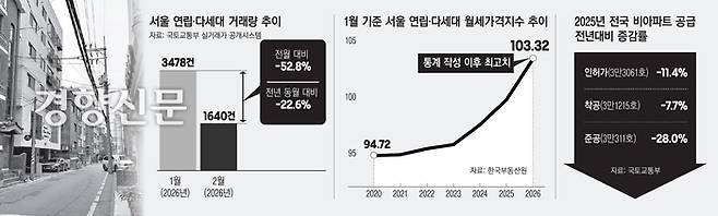2022년 전세사기 여파와 지난해 10·15 대책 등에서의 다주택자 대출 규제 강화 영향이 겹쳐 비아파트 시장 침체와 그에 따른 임대차 가격 불안은 이미 현실화되고 있다. 한국부동산원에 따르면 서울 연립·다세대 월세가격지수는 올해 1월 103.32로 통계 작성이 시작된 2012년 이후 최고치를 기록했다.