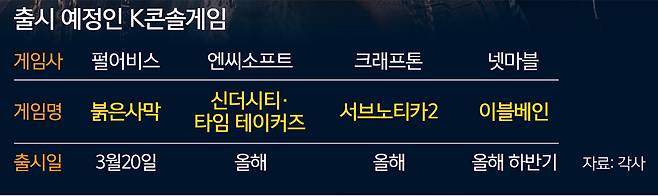 올해 한 해에만 붉은사막을 포함해 국내 게임사들이 내놓을 콘솔게임 기대작만 5개에 달한다. 2020년 첫 콘솔게임 퓨저로 콘솔시장에 발을 들인 엔씨소프트는 올 한 해 ‘신더시티’와 ‘타임 데이커즈’ 출시를 계획하고 있다. 자회사인 빅파이어게임즈에서 개발 중인 3인칭 오픈월드 슈팅게임인 신더시티는 동로마 제국과 파괴된 서울, 23세기 미래가 뒤섞여 있는 대체역사 SF 세계관을 배경으로 하고 있다.