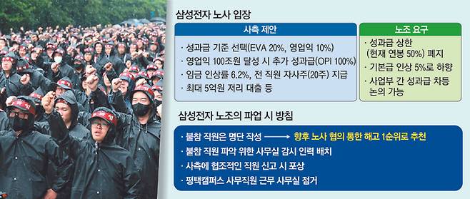 노조는 최근 결렬된 임금단체협상에서 ‘초과이익성과급(OPI)’ 상한 폐지를 요구했다. 메모리사업부의 지난해와 올해 OPI가 경쟁사인 SK하이닉스가 받은 성과급에 비해 크게 떨어진다는 이유에서다. 지난해의 경우 연봉 1억원 기준 삼성전자 직원의 성과급은 5000만원인데 SK하이닉스는 1억5000만원이란 것이다. 사측은 올해 메모리사업부에 대한 1억원 이상의 특별 포상금을 비롯한 보상안을 제안했다. 노조는 기본금 상승률 하향 조정 가능 등도 제시했지만 성과급 상한 폐지에서는 물러날 수 없다는 원칙을 고수하면서 파업 절차를 시작했다.