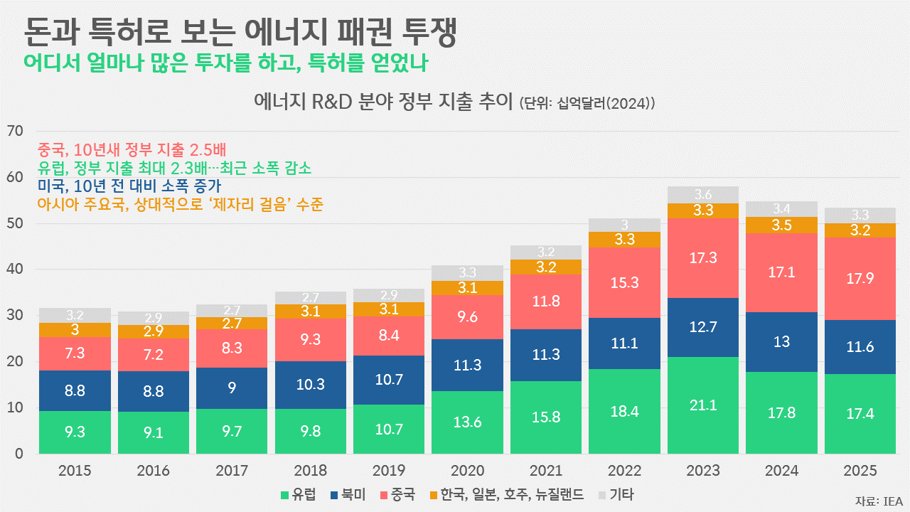 총액 차원에선 약한 감소세를 보였다 할지라도, 세부 지역별로 보면 상황은 조금 다릅니다. 2015년만 하더라도 유럽(93억달러)-북미(88억달러)-중국(73억달러) 순이었던 에너지 R&D 지출은 2021년 유럽(158억달러)-중국(153억달러)-북미(111억달러)로 순위 변동이 한 차례 일어났습니다. 중국의 R&D 투자 확대에 대응해 유럽은 이 규모를 2023년 211억달러까지 늘렸고, 미국 등 북미 국가들 또한 이전보다 더 많은 돈을 투입했지만 중국의 양적 팽창을 넘어서긴 역부족이었죠. 결국 2025년, 순위는 중국(179억달러)-유럽(174억달러)-북미(116억달러)로 또 다시 바뀌게 됐습니다. 유럽의 에너지 분야 R&D 지출이 2023년 211억달러에서 2024년 178억달러, 2025년 174억달러로 주춤해진 사이, 중국은 계속해서 이를 늘려 10년새 정부 지출이 2.5배가 된 겁니다.