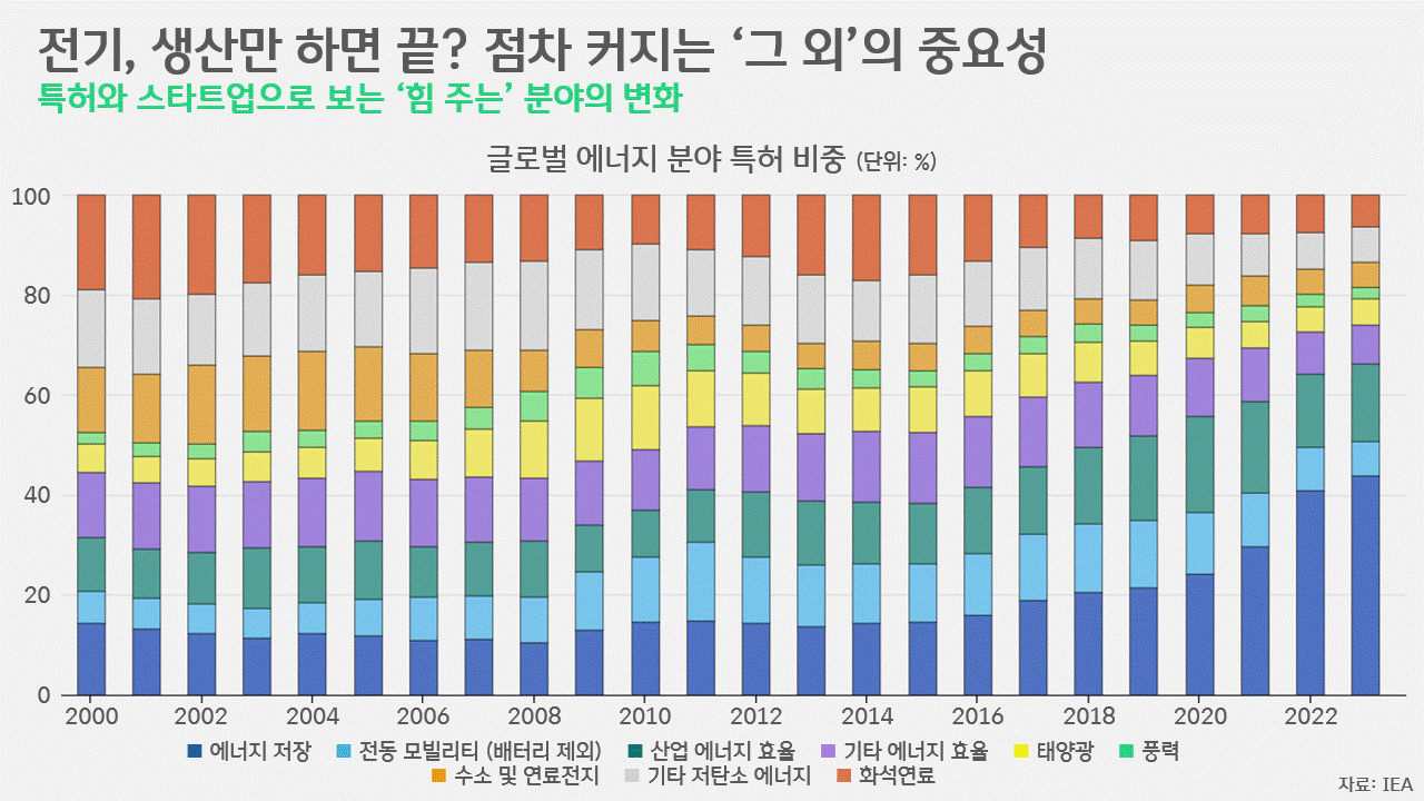 '무탄소 에너지원'으로 분류됨에도 불구하고 특허출원 비중이 20여년간 줄어든 분야도 있습니다. 바로, 화석연료 외의 기타 저배출 에너지와 관련한 특허와 수소 및 연료전지에 대한 특허입니다. 금세기 초만 하더라도, 화석연료에서 재생에너지에 기반한 전기화로의 전환 과정이 쉽지 않을 것이라는 판단에 과도기적인 '중간 단계의 에너지'를 찾기 위한 연구가 많았지만, 재생에너지의 확산이 인류의 에너지 역사상 전에 본 적 없는 수준으로 빠르게 이뤄지고 있고, 전기화 또한 다양한 분야에서 일어나면서 '중간 단계'의 필요성이 줄어든 탓으로 풀이됩니다. 더불어 수소 및 연료전지의 경우, 초창기 모빌리티 분야를 중심으로 수소의 쓰임을 찾다 2010년 이후부터 BEV가 미래 모빌리티의 '지배적 디자인'으로 등장한 점과 그린, 핑크 등 청정수소 생산에 대한 기술개발 이후 해당 기술을 적용한 설비의 대형화(Scale-up)이나 대중화가 당초 예측보다 더뎌진 점 등이 영향을 미쳤다고 풀이됩니다.