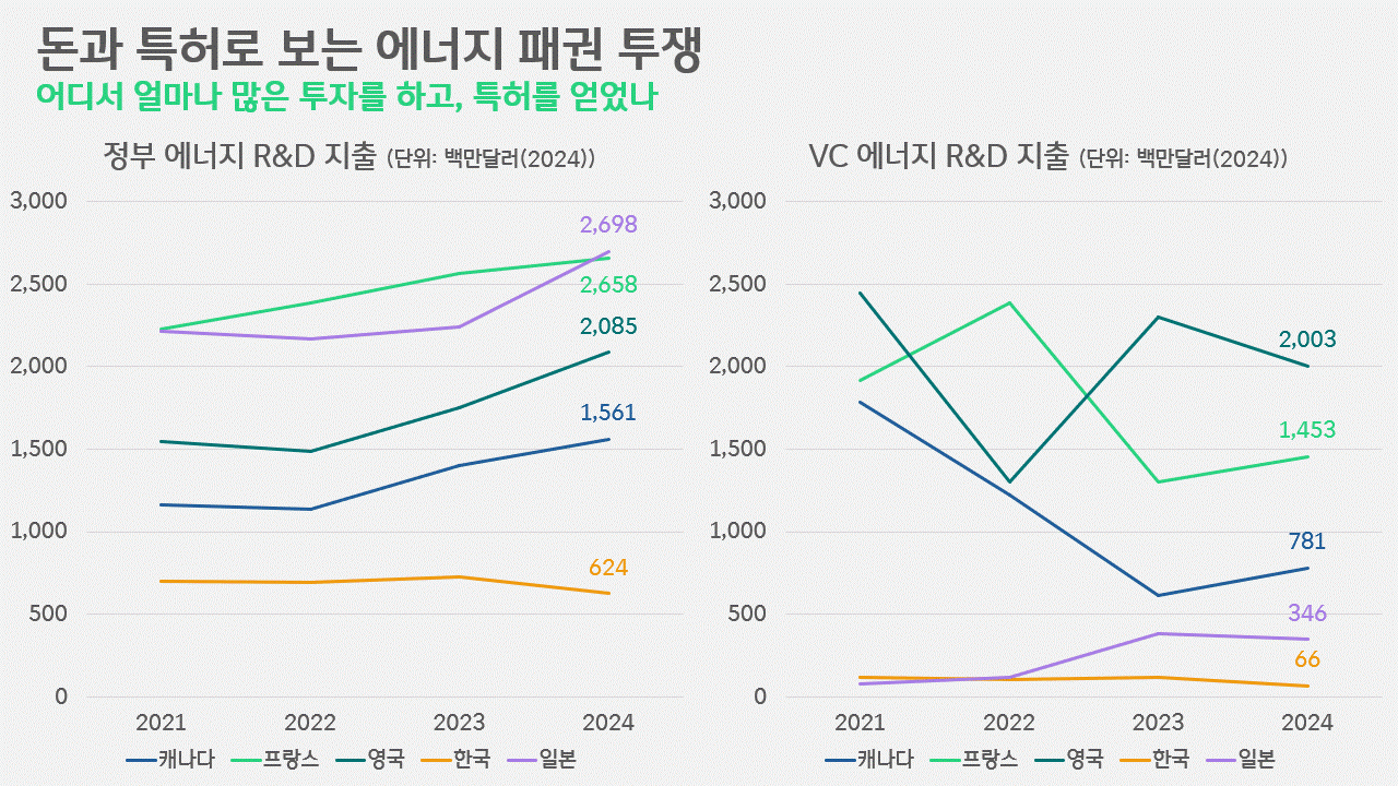 민간 차원의 투자인 VC의 에너지 R&D 지출은 일본을 제외하곤 공히 감소세를 보였습니다. 해마다 들쭐날쭉했다곤 하나, 비교 대상 5개국 가운데 VC의 에너지 R&D 투자가 가장 많았던 영국(2024년 기준 20억 300만달러)뿐 아니라 프랑스(14억 5,300만달러), 캐나다(7억 8,100만달러), 한국(6,600만달러) 모두 2021~2022년만 못 한 수준을 보였죠. 이들 중 유일하게 일본에서만 2021년 7,700만달러에서 2024년 3억 4,600만달러로 성장세를 기록했습니다.