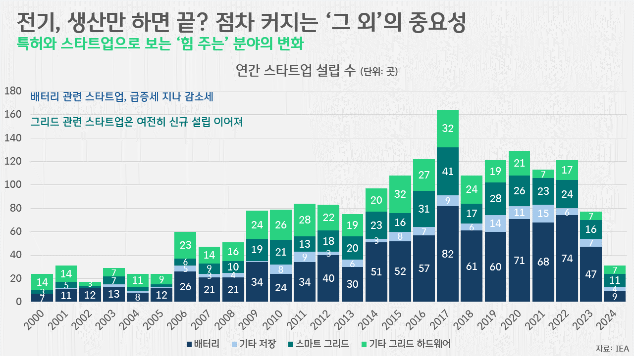 이러한 흐름 속에 그리드와 관련한 스타트업은 꾸준한 신규 설립이 이어지고 있습니다. 배터리 관련 스타트업과 마찬가지로 2017년이 정점(스마트 그리드 관련 스타트업 41곳, 기타 그리드 하드웨어 관련 스타트업 32곳)이었지만, 이후에도 여전히 관련 스타트업의 창업이 이어진 것이죠. 그 결과, 2024년 기준 스마트 그리드(11곳)-배터리(9곳)-기타 그리드 하드웨어(7곳)-기타 에너지 저장(4곳) 순의 분포를 보이게 됐습니다.