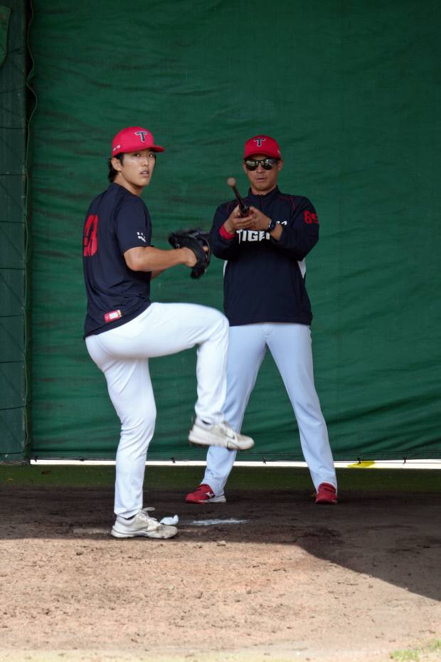 그는 또 "김태형은 지난해에는 신인이라 캠프에서 엄청 조심스럽게 빌드업했다. 올해는 선발 경쟁에 참여시켜 준비하고 있다. 반드시 성장해야 하는 선수다. 자리를 잡아줘야 KIA가 강한 팀 반열에 올라갈 수 있다"며 "김현수도 정말 좋은 자원이다. 고등학교 때 던진 이닝과 쉬었던 것을 감안해서 빌드업하고 있다. 처음부터 만들어서 쓰겠다는 게 아니라 프로에 적응하는 시간을 주고 있다. 시합 때 일부러 불펜에서 기존 선수들이 어떻게 경기 준비하는 지도 지켜보게 했다. 계획한 대로 캐치볼, 트레이닝, 경기 스케줄 정확한 날짜에 맞춰 소화하고 있다. (언론에) 언급되면서 오버페이스 할 수 있지만 제어해 주는 게 코치의 역할이다"고 설명했다.