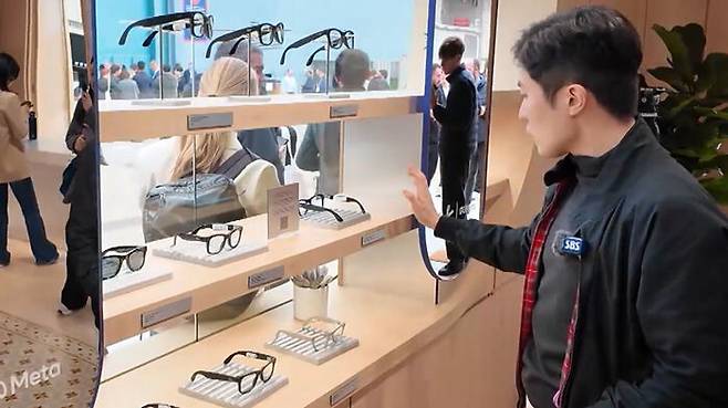 재밌는 점은 이렇게 손목에 딱 맞게 착용을 한 다음에 별도의 디바이스 없이 이 손가락의 움직임 만으로도 화면에 표시되고 있는 여러 가지 메뉴들이나 기능들을 선택하거나 조절할 수 있다는 건데요. 이렇게 검지손가락과 엄지손가락을 붙이면 '한 번 클릭'. 그다음에 중지와 엄지손가락을 붙이면 '뒤로 가기'. 그다음에 이렇게 조이스틱을 잡은 것처럼 주먹을 쥔 상태에서 엄지로 왼쪽, 오른쪽, 위, 아래로 움직이면 방향을 바꿀 수도 있습니다. 그리고 이렇게 손목이 움직이는 것 또한 스마트 밴드가 저절로 이해를 하기 때문에 다양한 자세에서 단순히 이렇게 팔을 내리기만 해도 손을 돌렸을 때 제가 뭘 하려고 하는지 정확하게 이해를 할 수가 있습니다. 이 스마트 안경을 제가 착용해 보니까요. 메타의 스마트 안경은 오른쪽에만 화면이 표시되거든요. 그래서 자연스럽게 시선이 한 군데에 맺힌 게 아니라 살짝 오른쪽으로 기운다는 느낌이 들고 있습니다. 그리고 이렇게 정면을 바라보고 있는 사람이랑 눈을 마주치지 못하고 살짝 오른쪽으로 시선이 자꾸 몰린다는 생각이 들었어요. 그 점은 조금 아쉽네요.