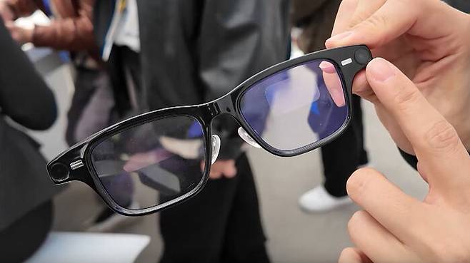 지금 이 제품을 보면 왼쪽과 오른쪽 렌즈에 각각 디스플레이가 표시되고 있고 앞부분을 보면 오른쪽과 왼쪽에 각각 서로 다른 카메라가 설치돼 있습니다. 그리고 윗부분에 보면 오른쪽과 왼쪽 귀 근처에 스피커가 달려 있어서 스마트 글래스에서 나오는 소리를 직접 들을 수가 있고요.