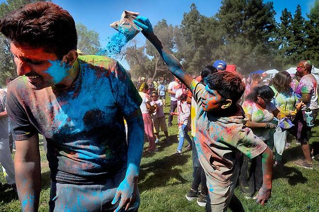 [로스앤젤레스=AP/뉴시스] 8일(현지 시간) 미 캘리포니아주 로스앤젤레스에서 열린 힌두교 색채 축제 '홀리' 참가자들이 색색의 가루를 뿌리며 축제를 즐기고 있다. 2026.03.09.