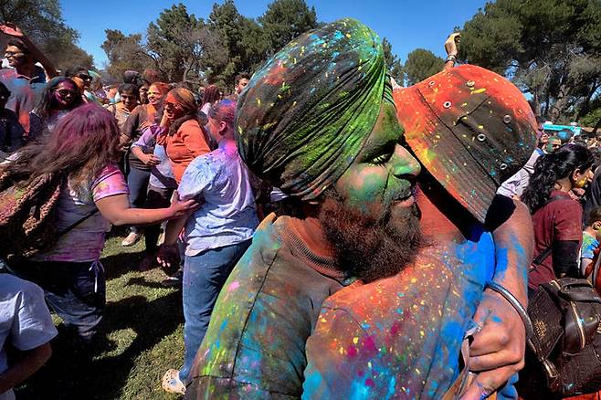 [로스앤젤레스=AP/뉴시스] 8일(현지 시간) 미 캘리포니아주 로스앤젤레스에서 열린 힌두교 색채 축제 '홀리' 참가자들이 색색의 가루를 맞으며 얼싸안고 춤추고 있다. 2026.03.09.