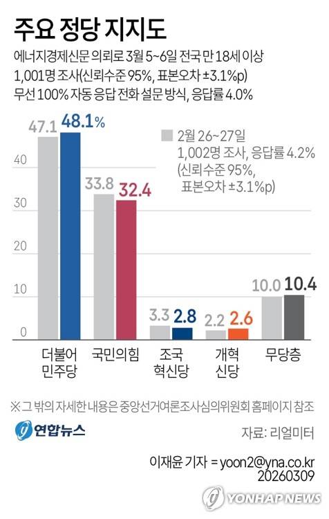 (서울=연합뉴스) 이재윤 기자 = 리얼미터가 에너지경제신문 의뢰로 지난 5∼6일 전국 18세 이상 1천1명을 대상으로 한 정당 지지도 조사에서는 더불어민주당이 48.1%, 국민의힘이 32.4%의 지지율을 기록했다.