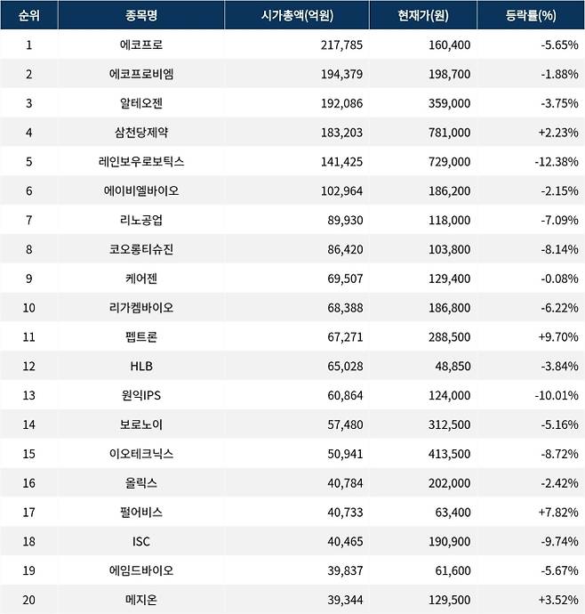 한편 시가총액 20위권 종목들은 펩트론(087010) 9.70% 상승, HLB(028300) 3.84% 하락, 원익IPS(240810) 10.01% 하락, 보로노이(310210) 5.16% 하락, 이오테크닉스(039030) 8.72% 하락, 올릭스(226950) 2.42% 하락, 펄어비스(263750) 7.82% 상승, ISC(095340) 9.74% 하락, 에임드바이오(0009K0) 5.67% 하락, 메지온(140410) 3.52% 상승 등의 성적을 기록하고 있다.