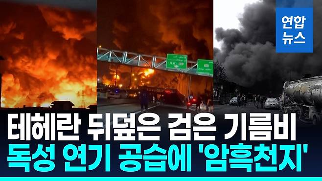(서울=연합뉴스) 미국과 이스라엘이 이란 수도 테헤란 주변 석유저장 시설을 폭격하면서 테헤란에 독성가스가 퍼지고 유독물질이 섞인 '기름비'가 내렸습니다.