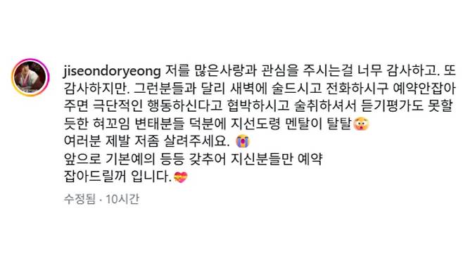 지선도령은 9일 자신의 계정을 통해 "저에게 많은 사랑과 관심을 주시는 건 너무 감사하지만, 새벽에 술 드시고 전화하시거나 예약 안 잡아주면 극단적인 행동을 하겠다고 협박하시는 분들이 있다"며 "술에 취해 듣기 평가도 못할 듯한 혀 꼬임, 변태분들 덕분에 멘탈이 탈탈. 여러분 제발 저 좀 살려주세요. 앞으로는 기본적인 예의를 갖춘 분들만 선별해 예약을 잡을 것"이라고 강조하며 간절한 당부를 덧붙였다.