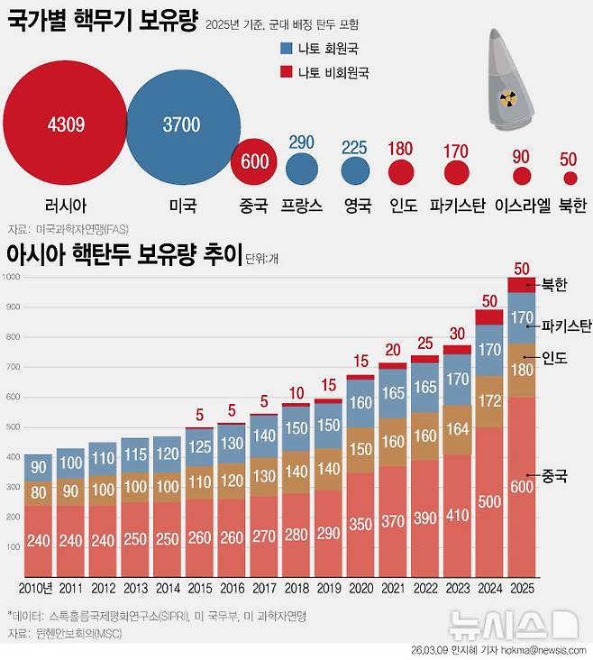 [서울=뉴시스] 트럼프 행정부 관계자들은 이란이 미국 본토를 타격할 수 있는 장거리 탄도 미사일을 개발하거나 핵 활동을 재개하는 것을 막는 것이 군사 작전의 궁극적인 목표라고 밝혔다. 스톡홀름 국제평화연구소(SIPRI)는 북한이 최대 50개의 핵탄두와 추가로 40개를 생산할 수 있는 핵분열성 물질을 확보하고 있다고 평가했다. (그래픽=안지혜 기자)