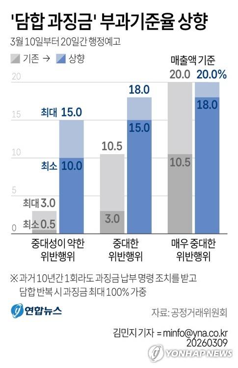 (서울=연합뉴스) 김민지 기자 = 9일 공정거래위원회에 따르면 앞으로 담합 적발 시 관련 매출액의 '최소 10% 이상'이 부과된다.