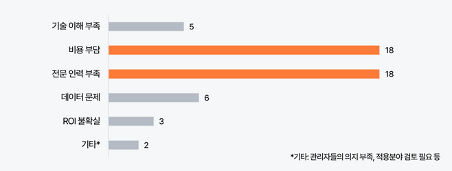 삼일PwC경영연구원이 중소 제조기업 29곳의 임원진을 설문조사한 결과, 조사에 응한 기업 대부분은 AI 도입의 필요성에는 공감했으나 △비용 부담 △전문 인력 부족 △데이터 문제 △기술 이해 부족 등을 이유로 실제 도입에 어려움을 겪고 있다고 답했다.