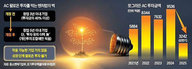 정부가 지난해 ‘초기기업’ 범위를 3년에서 5년 이내로 확대하는 방향을 발표했지만 현장에선 무용지물이라는 평가다. 기존 투자 유치 실적이 없는 스타트업으로 제한한다는 단서 조항이 붙었기 때문이다. 한 투자업계 관계자는 “3년을 넘긴 스타트업 가운데 외부 투자를 한 번도 받지 않은 기업은 찾기 어렵다”고 지적했다. 일부 개인 투자조합에 한정된 완화라 AC가 주로 운용하는 정책자금·벤처투자조합 등 대다수 펀드에는 기존 규제가 그대로 적용된다.