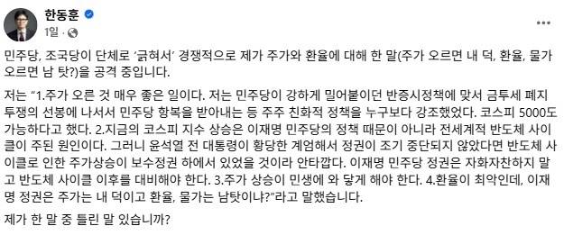 그는 8일 "민주당, 조국당이 단체로 '긁혀서' 경쟁적으로 제가 주가와 환율에 대해 한 말을 공격 중"이라며 "지금의 코스피 지수 상승은 이재명 민주당의 정책 때문이 아니라 전세계적 반도체 사이클이 주된 원인이다. 그러니 윤석열 전 대통령이 황당한 계엄해서 정권이 조기 중단되지 않았다면 반도체 사이클로 인한 주가상승이 보수정권 하에서 있었을 것이라 안타깝다"는 본인 발언에 틀린 얘기가 있느냐고 따져 물었다.