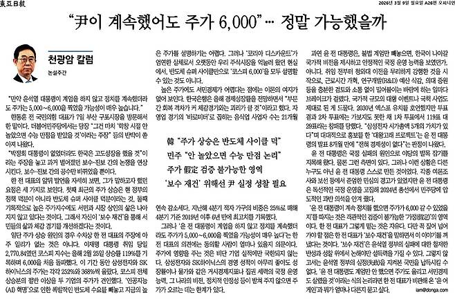 | ▲ 이러한 억지스러운 주장에 보수언론인 <동아일보>에서도 "윤어게인과 다른 게 뭐냐"는 일갈이 나왔다. 9일 천광암 <동아일보> 논설주간은 "尹(윤)이 계속했어도 주가 6,000"… 정말 가능했을까"라는 제목의 칼럼에서 "한 전 대표의 의견에는 동의할 사람이 얼마나 있을지 의문"이라고 지적했다. |