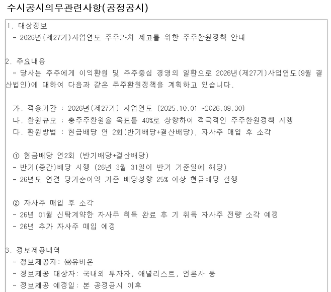 9일 금융감독원 전자공시시스템에 따르면 유비온(084440)은 이날 '수시공시의무관련사항(공정공시)'이라는 제목의 공시를 통해 2026년 사업연도 주주가치 제고를 위한 주주환원정책 정보를 안내했다. 회사는 연내 총주주환원율 목표를 40%로 상향해 적극적인 주주환원정책을 시행한다고 밝혔다.