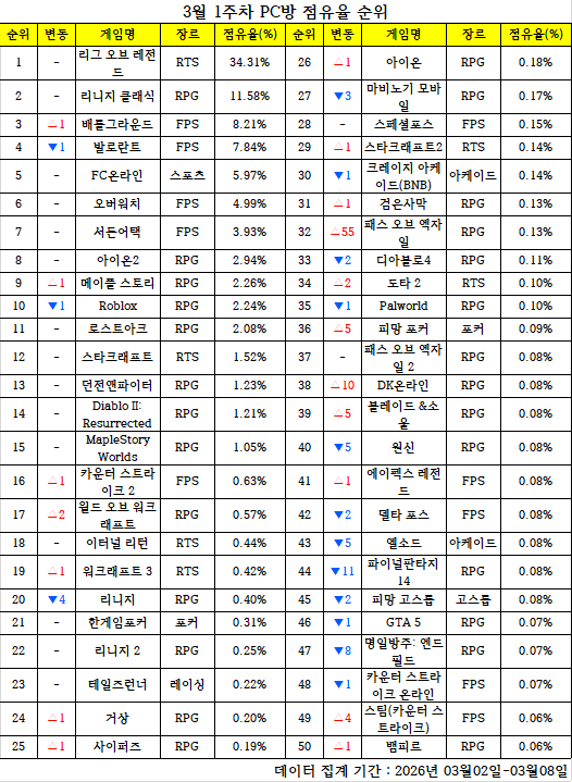 한 주간의 PC방 순위를 되짚어 보고, 어떤 변화가 있었는지 알아보는 'PC방순위' 코너입니다. 데일리게임은 매주 PC방 순위를 일목요연하게 정리, 독자들이 알아보기 쉽도록 제공합니다. 지난 한 주간 어떤 PC 온라인게임들이 눈길을 끌었는지 살펴봤습니다. < 편집자주 >