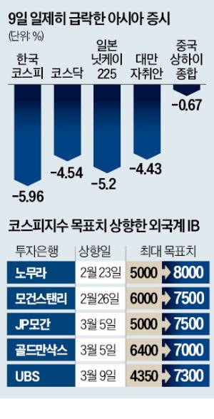 미국·이란과 이스라엘 간 전쟁이 장기화할 것이라는 우려가 커지며 코스피지수가 단번에 5200선까지 밀렸다. 고유가가 고착화하며 경기 둔화가 현실화할 수 있다는 공포가 증시를 짓눌렀다. 다만 스태그플레이션(고물가 속 경기 침체) 우려에도 해외 투자은행(IB)들은 잇따라 코스피지수 목표치를 올려 잡으며 “분할 저가 매수에 나설 때”라고 조언했다.
