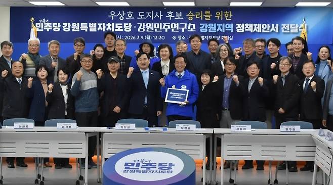 더불어민주당 강원도당(위원장 김도균)은 9일, 도당 회의실에서 '강원지역 정책제안서 전달식'을 개최하고 강원도 내 18개 시·군의 핵심 현안과 의제가 담긴 정책 보고서를 우상호 후보에게 전달했다고 밝혔다.