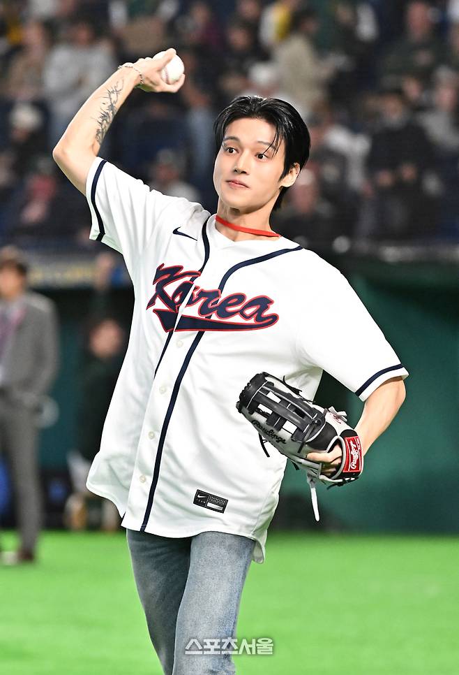 에이티즈 우영이 9일 일본 도쿄 도쿄돔에서 열리는 2026 월드 베이스볼 클래식(WBC) 조별리그 호주와 한국의 경기에 앞서 시구 연습을 하고 있다. 2026. 3. 9.