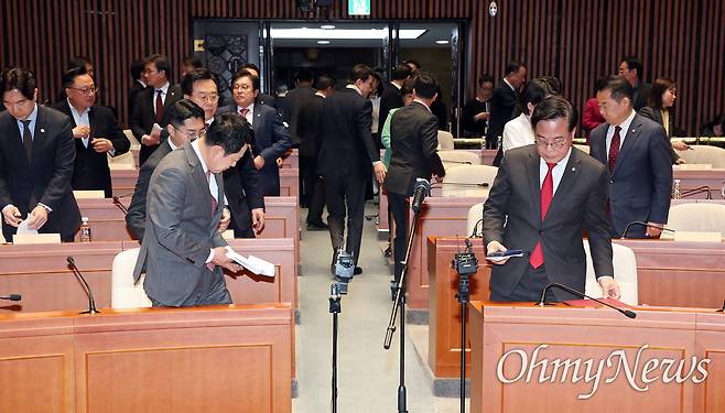 | ▲ '윤석열 절연' 결의 후 의총장 나서는 장동혁 장동혁 국민의힘 대표(왼쪽)를 비롯한 의원들이 9일 서울 여의도 국회에서 열린 긴급 의원총회에서 '계엄 사과', '윤석열 절연' 결의문을 낭독한 뒤 의총장을 나서고 있다. 오른쪽은 송언석 원내대표. |