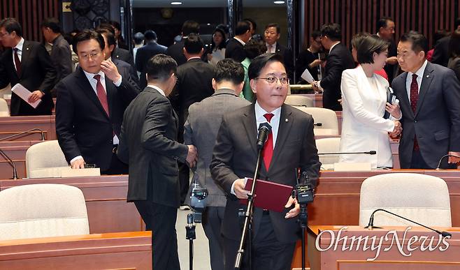 | ▲ '윤석열 절연' 결의 후 의총장 나서는 장동혁 장동혁 국민의힘 대표(가운데 뒷모습)를 비롯한 의원들이 9일 서울 여의도 국회에서 열린 긴급 의원총회에서 '계엄 사과', '윤석열 절연' 결의문을 낭독한 뒤 의총장을 나서고 있다. 오른쪽 앞은 송언석 원내대표. |