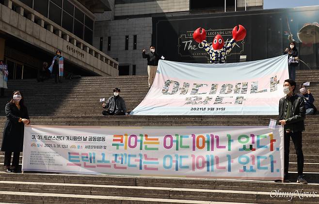 | ▲ '퀴어는 어디에나 있다. 트랜스젠더는 어디에나 있다 - 트랜스젠더 가시화의 날 기자회견'이 성소수자차별반대 무지개행동, 성소수자부모모임, 청소년트랜스젠더인권모임 튤립연대 등 관련 단체 회원들이 참석한 가운데 열리고 있는 모습. 2021.3.31. |