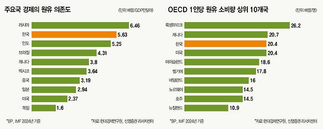 특히 이번 사태가 경제성장률과 물가에 미치는 영향은 한국이 유독 치명적일 수 있다는 분석이 나온다. 신영증권에 따르면, 한국은 1인당 원유 소비량(20.4배럴)과 경제의 원유 의존도(5.63배럴)가 경제협력개발기구(OECD) 회원국 기준 최상위권에 속한다. 중동으로부터 에너지 수입 의존도 또한 원유 70%, 천연가스 30% 이상으로 높은 편이다.