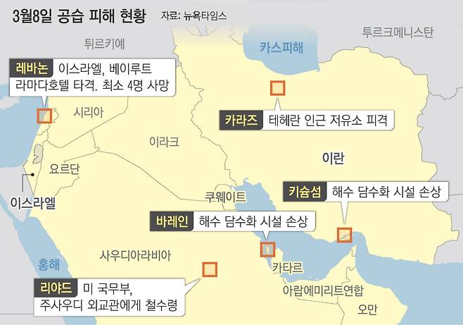 사우디에서는 처음으로 민간인 사망자가 발생했다. 프린스 술탄 공군기지 인근에 있는 알카르지 지역에 포탄이 떨어져 주민 2명이 사망하고 12명이 다쳤다. 쿠웨이트에선 정부청사가 화염에 휩싸였으며 국경 경비병 2명이 숨졌다. 바레인에선 주거 지역이 이란의 드론 공격을 받아 2세 아이를 포함한 32명이 다쳤다. 레바논 보건부는 이스라엘의 공습으로 지난 일주일 동안 최소 394명이 숨졌으며 부상자는 1130명에 달한다고 밝혔다.