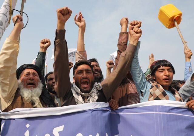 파키스탄 공습에 항의하는 아프가니스탄 시위대가 7일(현지시간) 낭가르하르주 잘랄라바드에서 반파키스탄 구호를 외치고 있다.