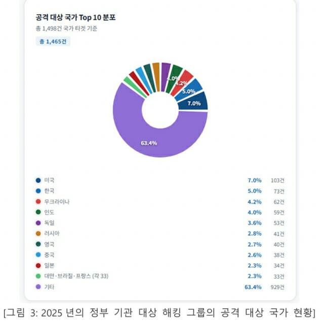 공격 대상 국가 분석에서는 총 1498건의 공격 대상 국가 정보가 확인됐고 미국(103건), 대한민국(73건), 우크라이나(62건), 인도(59건), 독일(53건) 순으로 집계됐다. 이러한 공격 대상 분포는 국제 정치 환경과 지정학적 갈등 구조가 사이버 공격 활동에 직접적인 영향을 미치고 있음을 보여준다. 특히 군사적 긴장이나 정치적 갈등이 존재하는 지역에서는 정부 기관을 대상으로 한 정보 수집형 공격이 지속적으로 발생하고 있는 것으로 확인됐다.
