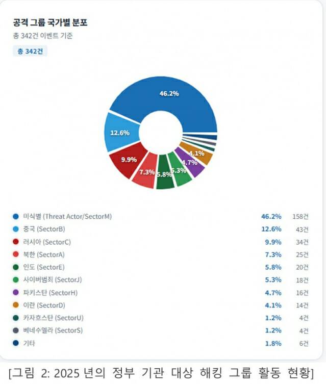 NSHC의 위협분석연구소가 2025년 일년간 수집한 공격 이벤트 데이터를 분석한 결과, 정부 기관을 대상으로 한 사이버 공격은 총 342건으로 확인됐으며, 최소 93개 이상의 해킹 그룹이 이러한 공격 활동에 관여한 것으로 나타났다. 이 가운데 중국, 러시아, 북한, 인도, 이란 등 국가 지원 해킹 조직이 주요 공격 주체로 확인됐고, 일부 공격은 사이버 범죄 조직에 의해 수행된 것으로 분석됐다. 또 전체 공격 이벤트 중 약 158건은 공격 주체가 명확히 식별되지 않은 미식별 위협 행위자에 의해 수행된 것으로 나타나 사이버 공격의 공격 주체 식별(Attribution) 어려움이 여전히 어려운 과제로 남아 있음을 보여줬다.