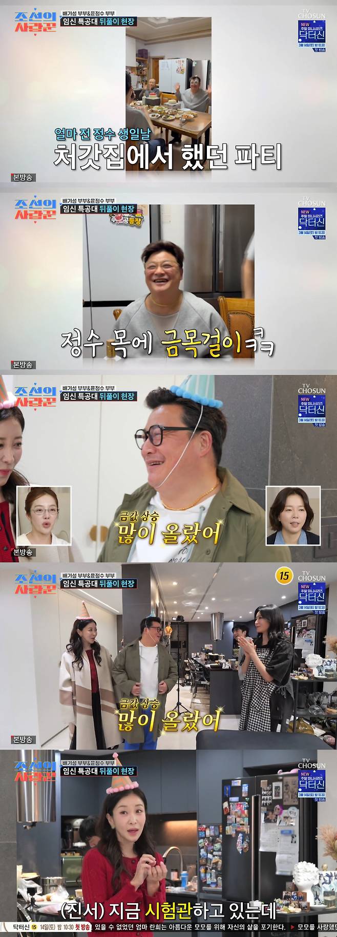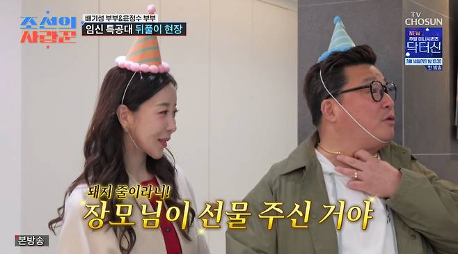 9일 방송된 TV조선 '조선의 사랑꾼'에는 배기성 부부가 윤정수 부부를 집으로 초대한 모습이 전파를 탔다.