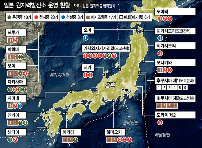 일본 원자력규제위원회 누리집을 보면, 일본 전역에 가동 가능한 원자로 33기 가운데 가시와 원전 6호기를 포함해 10기가 재가동됐다. 23기는 정지된 상태다. 후쿠시마 제1원전 원자로 6기는 전체가 완전히 폐쇄됐고, 또 다른 원자로 17기는 폐쇄 조처 중이다. 이와 별개로 시마네현 등에 새로 지어지는 원전도 3기가 있다.
