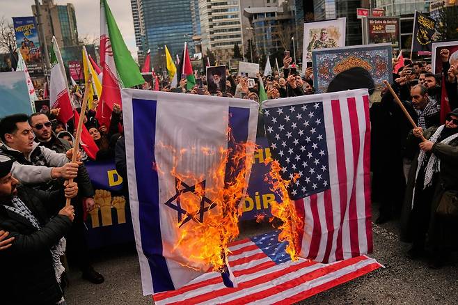 | 지난 1일(현지 시간) 튀르키예 이스탄불 주재 이스라엘 영사관 앞에서 시위대가 이스라엘과 미국 국기를 불태우고 있다. 이스탄불=AP/뉴시스 |