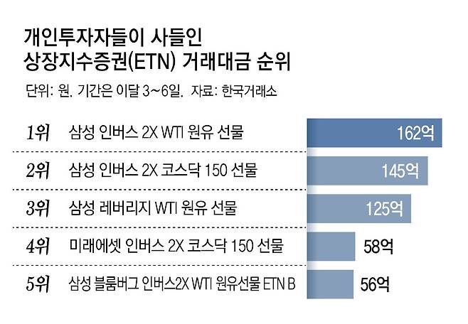특히 개인 투자자들의 매수세가 컸다. 이달 3∼6일 개인 투자자의 거래대금이 1위인 ETN은 ‘삼성 인버스 2X WTI 원유 선물’이다. 이 기간 거래대금은 162억 원으로, 전쟁 전인 지난달 24∼27일(20억 원)의 8배 이상으로 불었다.