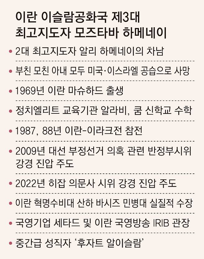 이란 최고지도자를 선출하는 88명의 전문가회의는 이날 “모즈타바를 이란 이슬람 공화국 체제의 제3대 지도자로 선출했다”고 밝혔다. 모즈타바는 혁명수비대와 핵무기 제조에 사용되는 고농축 우라늄 비축분에 대한 통제권 등 국정 전반의 최종 결정권을 보유하게 됐다. 혁명수비대는 모즈타바에게 충성을 바치겠다며 ‘완전 복종’을 선언했다.