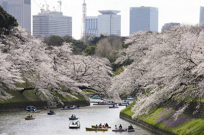 | ▲ 일본의 대표적 벚꽃 명소로 꼽히는 도쿄 도심 지도리가후치 연못에서 행락객들이 보트의 노를 저으면서 만개한 벚꽃을 즐기고 있는 모습. 2022.3.29 |