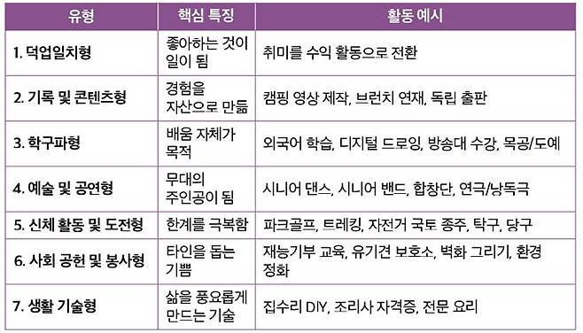 여섯째, 사회 공헌 및 봉사형이다. 타인을 돕는 기쁨을 느끼는 케이스다. 전직 직무 역량인 회계, 마케팅, IT를 사회적 기업이나 청년 스타트업에 전수하는 재능기부 교육이 있다. 동물을 사랑하는 마음을 유기견 보호소 봉사로 실천하거나, 벽화 그리기나 환경 정화 같은 지역사회의 외관을 개선하는 창의적인 봉사활동도 있다.