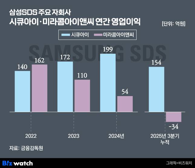 이에 비해 삼성SDS가 지분 86%를 보유한 스마트팩토리 기업 미라콤아이앤씨는 수익성이 급격히 줄고 있다. 이 회사의 영업이익은 2022년 162억원, 2023년 110억원, 2024년 54억원으로 감소세를 기록했다. 지난해에는 3분기까지 34억원의 영업손실을 냈다. 지난해 당기순이익도 3년전(142억원)에 비해 90% 이상 줄었다.